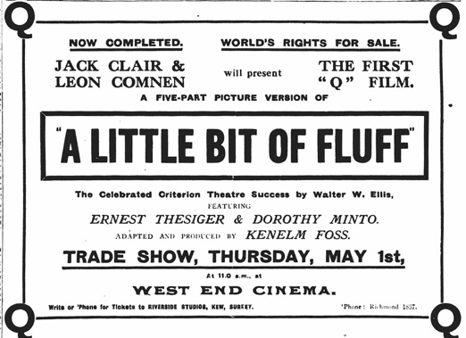 “Everybody likes a good laugh. Let us recommend one, viz, A Little Bit of Fluff, a Q film with Dorothy Minto and Ernest Thesiger. It’s a perfect scream from start to finish, and the acting in several of the ludicrous scenes is clever - that’s the very word for it. We believe that this is Ernest Thesiger’s first appearance in the movies.”