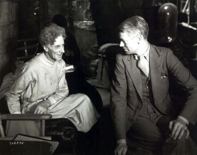 “Again I went to Hollywood to do another picture for James Whale - ‘The Bride of Frankenstein’ and again worked with Boris Karloff, who is a very different person without his horrific makeup - kind and surprisingly gentle. On the screen he is definitely ‘Karloff’ but in private life his real name of Pratt suits him better. My makeup in ‘The Bride’ took long enough to put on - about an hour and a half, but poor Boris had to be worked upon for nearly three hours, by which time his face had been so much overlaid with chicken skin and rubber solution that I didn’t dare make him laugh in case the whole elaborate creation of the makeup man [Jack Pierce] (as conceited an artist as ever I came across) should be ruined. Boris couldn’t sit down; so heavily padded was he that he had to have a special seat made for him - more like a back-board with a ledge on which he put the part that most people sit upon. How I disliked that makeup man! But he certainly knew his business.”
